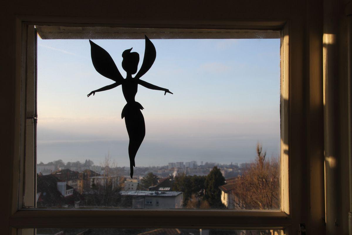 A l'occasion d'une exposition collective en 2002 au Kunsthaus de Grenchen (CH), intitulée "Anges & co", je proposais une intervention discrète sous la forme d'une découpe autocollante noire qui évoquait la silhouette d'une petite fée. J'en expliquais ainsi le principe aux responsables du musée:
